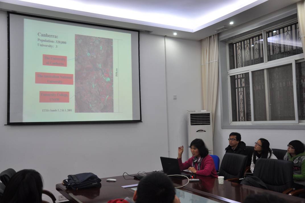 2011年12月9日上午10时,武汉大学测绘遥感信息工程国家重点实验室106会议室人头攒动。来自澳大利亚南新威尔士大学工程与信息技术学院的贾秀萍教授应邀来我组访问,带来了精彩的题为《 Hard Classification and Soft Classification 》的学术汇报,并与张良培教授以及小组的研究生代表进行了深入的学术交流。 贾老师从遥感影像的信息提取开始谈起,回顾了近年来从多光谱遥感到高光谱遥感发展历程中不断涌现的信息提取的方法及其相应的模型,并且深入浅出地介绍信息提取所最终服务的硬分类和软分类的基本方法与思想。详细剖析了当前遥感图形处理领域各种分类方法的利弊并分享了自己的心得和思考,为大家展示了近些年来她的研究成果和算法思想。交流过程中,贾老师针对遥感影像中普遍存在的混合像元问题和大家进行了深入的探讨,精确解读了关于混合像元问题的一些基础的关键概念,并对该问题提出了自己的想法和建议,在大家补充知识的同时,表达出了对莘莘学子的殷殷希望和鼓励。 报告结束后,同学们针对自己的科研中的困惑和问题与贾老师进行了细致热烈的讨论。在认真听取学生的疑惑后, 贾老师从自己多年的科研经验和学术经历出发,一一为学生进行了详细的解答和建议。 贾秀萍教授的汇报引起了大家的广泛兴趣和思考,然而两个小时如白驹过隙,大家意犹未尽的离开了会场,但是都表示受益匪浅。
