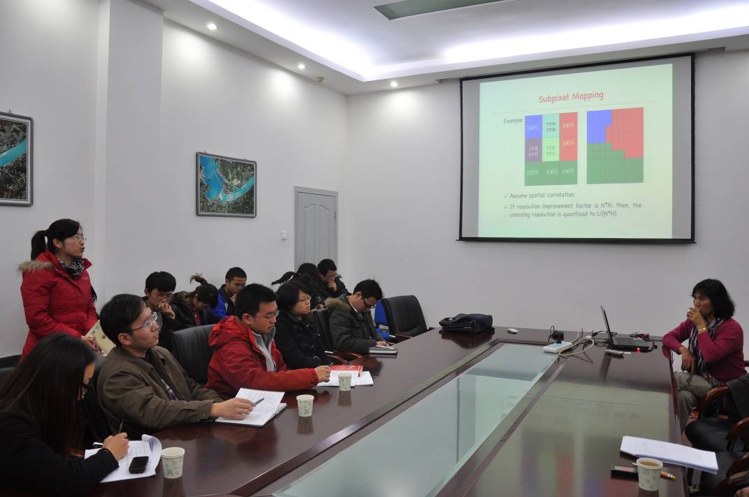 2011年12月9日上午10时,武汉大学测绘遥感信息工程国家重点实验室106会议室人头攒动。来自澳大利亚南新威尔士大学工程与信息技术学院的贾秀萍教授应邀来我组访问,带来了精彩的题为《 Hard Classification and Soft Classification 》的学术汇报,并与张良培教授以及小组的研究生代表进行了深入的学术交流。 贾老师从遥感影像的信息提取开始谈起,回顾了近年来从多光谱遥感到高光谱遥感发展历程中不断涌现的信息提取的方法及其相应的模型,并且深入浅出地介绍信息提取所最终服务的硬分类和软分类的基本方法与思想。详细剖析了当前遥感图形处理领域各种分类方法的利弊并分享了自己的心得和思考,为大家展示了近些年来她的研究成果和算法思想。交流过程中,贾老师针对遥感影像中普遍存在的混合像元问题和大家进行了深入的探讨,精确解读了关于混合像元问题的一些基础的关键概念,并对该问题提出了自己的想法和建议,在大家补充知识的同时,表达出了对莘莘学子的殷殷希望和鼓励。 报告结束后,同学们针对自己的科研中的困惑和问题与贾老师进行了细致热烈的讨论。在认真听取学生的疑惑后, 贾老师从自己多年的科研经验和学术经历出发,一一为学生进行了详细的解答和建议。 贾秀萍教授的汇报引起了大家的广泛兴趣和思考,然而两个小时如白驹过隙,大家意犹未尽的离开了会场,但是都表示受益匪浅。