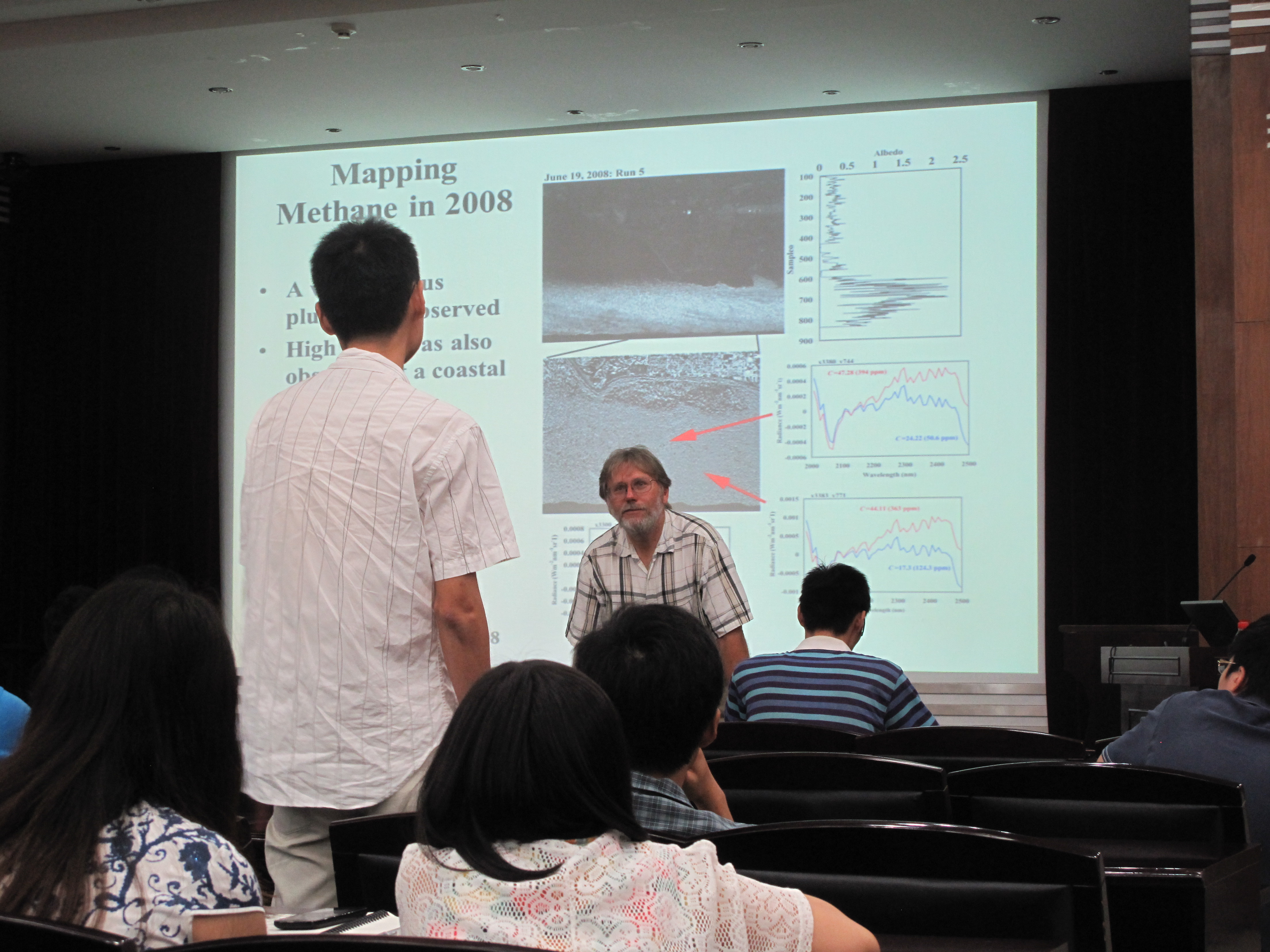 本次报告的主题是利用高光谱技术监测自然界和人为甲烷排放。 Dar Roberts 教授首先介绍了甲烷对温室效应的影响,以及在化石燃料广泛使用的当代监测甲烷的重要性。然后, Dar Roberts 教授详细分析了辐射传输敏感性对甲烷监测的影响、并阐述了实验室测量和现场观测数据已验证利用遥感技术监测甲烷排放的可行性。随后的报告详细展示了 Dar Roberts 教授和学生们的工作成果:利用 AVIRIS 高光谱遥感数据进行甲烷排放监测的几种方法。最后, Dar Roberts 教授给出了利用上述技术在美国加州 Santa Barbara 及 Los Angeles 地区进行甲烷排放监测的实例。随后,小组师生与 Dar Roberts 教授就报告中相关问题进行了的讨论和交流。